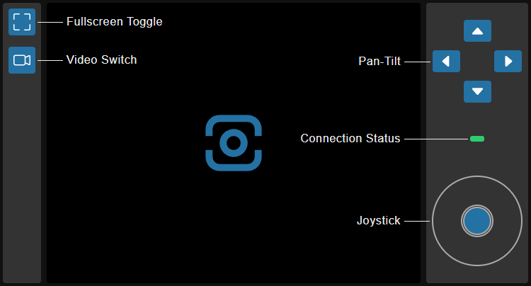 The console has built-in basic functions such as full-screen switching, video switch, pan-tilt and joystick controls. The pan-tilt and joystick are connected to physical servos or DC motors through system settings (Console). When Node-Camera is integrated into a compatible pan-tilt or chassis, it can be controlled from the page after configuration.