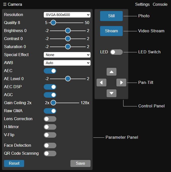 Set the camera parameters on the Camera page, see Camera Settings for details. Click the Still button to view real-time photos, or the Stream button to start the video stream. The firmware supports SVGA 800x600 resolution with a 25FPS video transmission frame rate. If you've configured LED port or pan-tilt servos in the system settings, you can control the LED switch or pan-tilt actions from the panel. To maximize the display area, click the ☰ Camera button in the navigation bar to collapse the parameter panel.